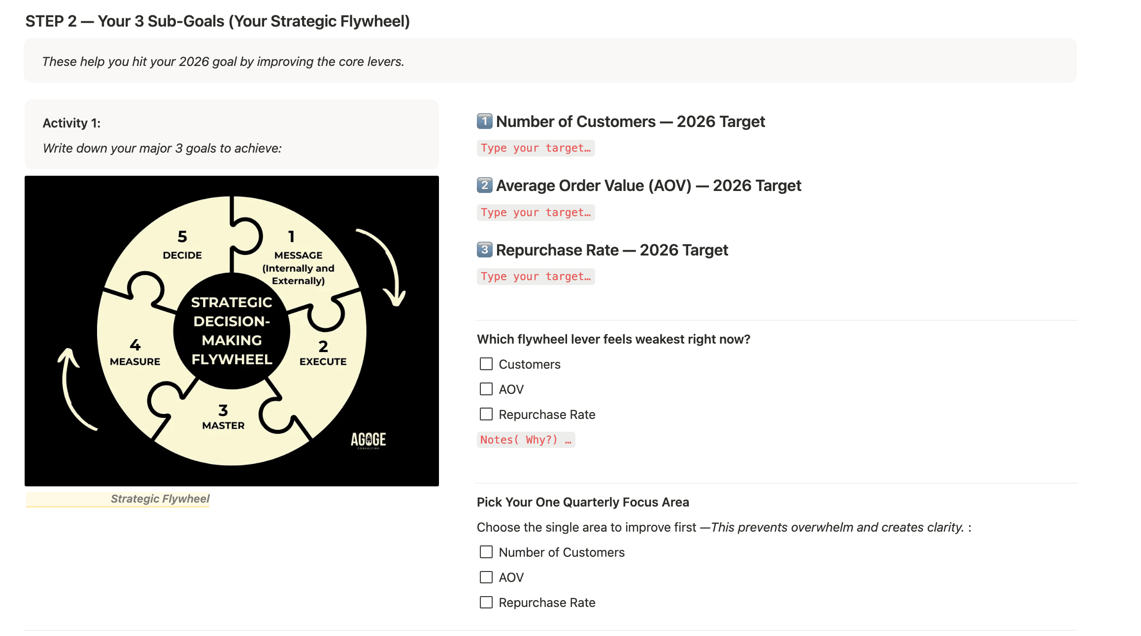 Now, let's talk strategy. January is when last year’s bad decisions finally show up. If your strategy lives in Slack threads and half-remembered meetings… You don’t have a strategy. Don’t be that CEO. Today I wanted to pass along some planning tools to boost your 2026 decision-making: First: The annual planning framework I use with all my clients. Your Strategy Needs A StrategyEvery founder knows the feeling: You said yes to 19 things this quarter. A giveaway here. Everyone is working harder. This is the CEO death loop. Most companies don’t stall because they’re lazy. They stall because they’re busy in all the wrong directions. More hours. The real problem? Most CEOs don’t have a strategy problem. When you don’t know what truly matters, you say yes to everything. And when everything is a priority… nothing is. YOUR STRATEGY NEEDS A STRATEGY That’s why you need a strategic plan. Here’s the fix: Run the MDMA cycle. Measure → Decide → Market → Act. Then run it back. Measure what’s actually happening. Once you do this, the bottleneck becomes obvious. For Example: One of my clients spent the last 3 years perfecting the product. Revenue flat. Switched efforts to top of funnel awareness, revenue exploded. (FYI if you don’t know it… you’re the bottleneck.) This is where annual strategic planning becomes your unfair advantage. To do this, you need four things: 1. A Planning Team of Deciders: You have two types of people in your company: Deciders and Doers. Deciders own outcomes, not activities. The people who win repeatedly… not the ones who talk the most. Example: My Head of Sales who owns the revenue number, not just "sales activities." 2. A Vision Dashboard: Your 3-year map. Clear targets. Zero ambiguity. If your team can’t see the destination, how can you expect them to all row in the same direction? Example: "$100M ARR, 30% margins, 2 product lines, 5,000 customers by 2027. 3 Strategic Projects to get us there." 3. A Strategic Flywheel: The operating system of the company. When you spin it, everything else gets easier. Great CEOs obsess over this. Everyone else obsesses over tactics. Example: Every happy customer creates content that attracts 3 more customers. Simple. Repeatable. Compoundable. 4. A Strategic Roadmap: The multi-quarter sequence that forces focus and kills shiny object syndrome. Example: Q1: Fix retention. Q2: Scale what's working. Q3: Launch adjacent product. Q4: Expand internationally. When you combine all four, chaos disappears. Decisions get easier. The founders who scale aren’t the ones who do the most. You have 2 weeks left in January. Use them or lose another year. ⬇️ To Download:👉 CEO Strategic Planning 2026 👈 🔖 To Bookmark:• System: This is still the best goal planning framework I’ve found Last but not least. Your reminder of what your team needs to perform their best: See you at $100m 🤝 |
