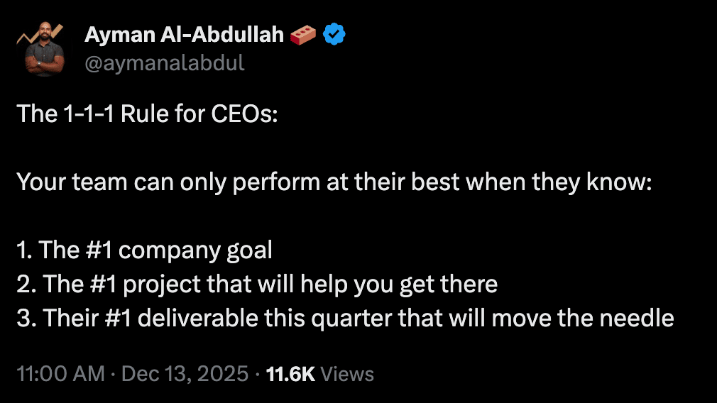 Why you’re getting this: I’m Ayman Al-Abdullah and this is my CEO Newsletter. You probably signed up via one of my social links 🔗 Twitter — Instagram — TikTok Thanks for reading, and on to this week's edition. One of the most frustrating experiences as CEO is feeling like your leadership team is sprinting in opposite directions. Your job as CEO is to align them around a common goal. “Every person in your company is a vector. Your progress is determined by the sum of all vectors.” - Elon Musk...